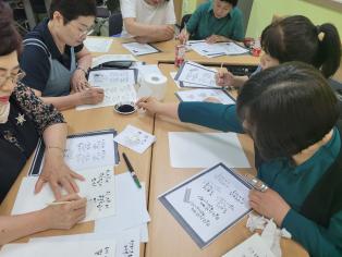 - 9월 11일과 25일 요양보호사 동아리 모임을 가졌습니다. 4월에 시작한 캘리그라피 동아리가 추석을 맞아 용돈봉투 쓰기를 마지막으로 모임을 마무리했습니다. 아쉬움을 달래기 위해 즐거운 게임도 하며 지나온 시간을 추억하였습니다. 한 글자 한 글자 써 내려가던 떨리는 손끝이 문장을 쓰고 예쁜 그림도 그려가며 우린 그렇게 함께 성장했고 기뻐했습니다. 요양보호사님들의 귀한 시간을 기억하고자 작은 작품집을 만들기로 했습니다. 동아리 모임 하는 동안 건강권을 위한 기초검사와 근골격계 체조 배우기도 하고 요양보호사님의 현장 목소리를 듣기 위해 간담회도 가졌습니다. 내년에는 준비를 더 많이 하여 다시 만날 것을 약속했습니다. 수고해주신 한현숙 강사님께도 감사드립니다. 모두 수고 많으셨어요.