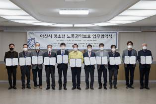 - 12월 9일 아산시청 상황실에서 「아산시 청소년 노동인권증진을 위한 청소년 노동권익보호 업무 협약식」을 오세현 아산시, 김주택 고용부천안지청장, 이문희 아산교육지원청 교육장과 8개 고등학교(배방고, 설화고, 아산고, 아산전자기계고, 온양고, 온양여고, 온양용화고, 한올고)) 교장선생님들이 참석하신 가운데 진행되었습니다. 아산시비정규직지원센터가 2015년 아산지역 청소년 노동인권 실태조사를 시작으로 꾸준히 이어온 청소년 노동인권 사업은 지자체의 관심과 청소년 유관기관과 각 학교의 협조 덕분이었습니다. 청소년 노동인권 교육과 상담 및 권리구제의 실효성 높이고, 관련 유관기관의 상호 협력을 통해 일하는 청소년들의 인권과 권리를 보호하고, 더 나은 노동환경을 만들기 위해 이번 협약을 진행하게 되었습니다. 이번 협약을 통해 청소년 노동인권 실태조사 및 정책연구, 상담과 권리구제지원, 청소년 또래지킴이 활성화, 청소년 지킴이 운영과 지원, 청소년 노동인권 사업이 더 활발하고 체계적으로 진행 될 예정입니다.
