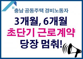 - 공동주택(아파트) 경비노동자들의 초단기근로계약(3개월, 6개월)이 충남지역에도 확대되고 있어, 경비 노동자들이 심각한 고용불안에 시달리고 있습니다. 충남지역에서 경비노동자들의 권리를 보호하기 위해 활동하고 있는 충남경비노동자지원사업단(아산 ․ 당진 ․ 서산시비정규직지원센터, 충남노동권익센터)는 이 문제를 해결하기 위해 지난 3월 30일 문제해결을 촉구하는 기자회견과 함께 “공동주택 경비노동자 3개월 ․ 6개월 초단기계약문제 충남에서 먼저 근절하자!”는 도민 캠페인을 진행하고 있습니다. 경비노동자들의 고용불안문제가 조금이나마 해결 될 수 있도록 아산시민들께서도 많은 관심과 참여를 부탁드립니다.(사진을 참고해 주세요)
