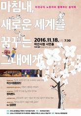 - "마침내, 새로운 세계를 꿈꾸는 그대에게" ○ 일시: 2016년 11월 18일(금) 19:30~21:30 ○ 장소: 아산시청 시민홀 ○ 관람을 원하시는 분은 누구나 무료로 관람할 수 있습니다. 첫번째 이야기: 힘겨운 오늘을 살아가는 그대에게 건네는 위로_아산시립합창단 아산시민이 있는 곳이라면 어디든지 찾아가는, 아산시립합창단입니다. 아산시민들의 문화와 행복이 있는 삶을 함께 만들어가려 합니다. 장르를 불문하고 어떤 음악이든지 탁월한 표현력으로 연주곡의 시대성과 역사성도 놓치지 않고 연주하는 합창단입니다. 프로그램: 뮤지컬 레미제라블 중 Bring Him Home, 깐쪼네 메들리(창공의 빛난 별 외), 늴리리맘보, 뱃노래 등 [영상]비정규직 노동자 이야기_위험에 내몰리는 비정규직 두번째 이야기: 오늘을 살아내는 힘, 멈추지 말아줘_정득밴드 노래하는 사람 임정득과 그의 친구들로 구성된 밴드입니다. 거리에서 만들어진 노래들이 각기 다른 악기들과 새로운 사람들을 만나 때로는 따뜻하게 때로는 슬프게, 아름답게 삶의 이야기를 건네고자 합니다. 프로그램: 소금꽃나무, 멈추지말아줘, 조율, 상상하다, 벨라차오, 땡큐 노동자 이야기_갑을오토텍 가족과 유성기업 노동자가 보내는 편지 세번째 이야기: 연대와 희망의 새로운 세계를 꿈꾸다_테너 임정현 노동자합창단인 이소선 합창단의 상임지휘자입니다. 수회의 독창회 개최 및 음악회 출연, 오페라 과 칸타타 제작 및 주연 등의 경력을 가지고 있습니다. 음악은 땀 흘려 일하는 대다수 사람들의 풍요를 위한 것이어야 한다는 믿음을 가지고 있습니다 프로그램: 구성 중 ○ 주최: 민주노총 세종충남지역본부, 아산시비정규직지원센터 ○ 주관: 아산시비정규직지원센터 ○ 후원: 금속노조현대자동차지부아산위원회, 세종충남지역노조, 금속노조 충남지부 ○ 참여: 아산시노사민정협의회