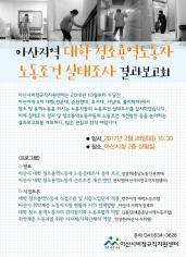 - 아산시비정규직지원센터는 2016년 10월부터 12월까지 아산지역 대학청소용역노동자 실태조사를 실시하고, "아산지역 대학청소.용역노동자 노동조건 실태조사 결과 보고회"를 진행한다. 센터는 2014년 '아산지역 공동주택 청소노동자 실태조사'에 이어 2015년 '아산시 직.간접 노동자 실태조사'를 실시하는 등 취약계층 노동자 실태조사를 진행해 왔다. 2016년에는 상시적인 고용불안과 저임금에 시달리고 있는 아산시 권역 내 '대학 청소용역노동자 실태조사'를 실시하고 이를 통해 비정규직노동자의 '실질적인 근로조건 개선 및 지원방안 모색'을 위해 아산지역 5개 대학에 대해 직접 방문 면접조사를 진행한 결과를 보고하기 위해 아래와 같이 보고회를 열고 그 결과를 발표한다. 관심있으신 분은 누구나 참여가능합니다. 많은 참여와 관심부탁드립니다. ** 아 래 ** 1. 일시 및 장소 - 일 시 : 2017년 2월 28일(화) 16:30 ~ - 장 소 : 아산시청 2층 상황실 2. 개요 - 조사기간 : 2016.10. ~ 2016. 12. 31(3개월) - 조사대상 : 아산시 권역내 5개 대학(교)와 인근지역(천안)대학 2개교(총 7개교) - 조사방법 : 방문 설문조사 및 심층면접조사 - 조사인원 : 총155명의 대학 청소.용역노동자와 학교.용역회사 관계자 - 조사항목 : 고용, 임금등 근로조건, 휴게시설, 산업안전, 인권침해 등 3. 기타 - 토론회와 관련된 내용은 첨부된 자료를 참고하시기 바라며, 상세한 내용은 아산시비정규직지원센터로 문의해 주시기 바랍니다.