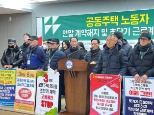 - 공동주택(아파트)에서 근무하시는 경비노동자들이 2024년 새해 초부터 충남도청에서 ‘고용불안을 야기하는 초단기계약(3개월, 6개월 등)을 근절’하기 위해 1월 8일(월) 10:30분 기자회견을 진행하였습니다. 이날 기자회견에는 천안·아산·당진·서산과 충남지역 아파트에서 경비원으로 근무하고 있는 경비노동자들과 이분들을 지원하고 있는 아산시비정규직지원센터·당진·서산시비정규직지원센터와 충남노동권익센터에서 함께 참여하였으며, △ 고용불안의 원인 초단기 근로계약 근절과 △ 무차별적으로 진행되는 구조조정(인원감축)으로 인해 상시적으로 고용불안에 시달리고 있는 현실을 입주민들과 도민들에게 알리고 지자체와 고용노동부의 적극적인 공적책무를 다 해 줄 것을 요구하였습니다. 고령의 공동주택 경비노동자들 연말과 연 초 근로계약 해지와 3개월짜리 초단기근로계약으로 고용불안과 이로 인한 생계위협으로 떨고 있으며, 부당한 대우(처우)에도 초단기계약으로 인한 계약해지에 대한 두려움으로 인해 개선을 요구하거나 건의조차 할 수 없는 것이 현실입니다. 센터는 비정규직 · 취약노동자인 공동주택 종사노동자의 노동권익보호를 위해 2024년에도 다양한 제도개선과 다양한 사업을 아파트 경비노동자분들과 함께 진행할 예정입니다. 이하 [기자회견문 전문] 함께 잘 사는 공동체! 공동주택 노동자 노동인권 보호에서 시작합시다!! 최근 경제협력개발기구 OECD는 2023년 연금 보고서를 발표했습니다. 관련 기사에 따르면 는 한국 밖에 없다고 합니다. 이 한 줄이 우리 사회의 현재 모습을 보여줍니다. 65세 이상 인구의 고용률도 21년 기준 34.9%로 OECD 국가 가운데 가장 높습니다. 가난하니 은퇴 후에도 일을 할 수밖에 없는 것입니다. 이미 너무 많이 들어, 충격적이지도 않은 또 다른 사실이 있습니다. 한국의 노인인구 자살은 10만 명당 40명에 달합니다. 이 역시 1위입니다. 그것도 OECD 회원국의 평균 두 배가 넘는 수치입니다. 자살을 생각해 보았다는 노인이 꼽은 가장 큰 이유는 경제적 어려움(27.7%)입니다. 이게 지금 우리 대한민국의 현실입니다. 은퇴자들은 가난하기 때문에 은퇴 후에도 일을 멈출 수 없습니다. 대표적인 고령노동자를 위한 일자리가 바로 공동주택 경비·미화 일자리입니다. “임계장”이라는 말이 있습니다. “임시직 계약직 노인장”의 줄임말입니다. 그러나 이제 계약직이라는 말도 무색한 “초단기 계약” 늘어나고 있습니다. 공동주택 경비노동자들의 업무는 상시업무입니다. 그러나 2년 미만의 기간제 계약도 찾아보기 어렵습니다. 그나마 1년씩 맺어오던 계약마저 최근에는 3개월 1개월짜리 계약이 늘고 있습니다. 이런 계약을 초단기 계약이라 부릅니다. 그런데 사실 아파트 입주민들은 초단기 계약에 대해 잘 알지 못합니다. 그렇게 계약을 해야 할 이유에 동의하는 비율도 높지 않습니다. 초단기 계약은 노동자를 위축시키고 고용불안을 느끼게 만듭니다. 이 불안이 바로 노동자들을 을로 만들고 우리사회의 “갑-을문제”를 만드는 주범입니다. 이제 이런 초단기 계약은 멈춰야 합니다. 주민들을 위해서라도 공동체의 상생을 위해서라도, 아니 우리사회 전체를 위해서라도 최소 1년 이상의 계약이 보장되어야 합니다. 또 다른 호소를 드립니다. 초단기 계약과 함께 사람을 마음대로 쓰다 버려도 되는 것처럼 생각하는 구조조정도 문제입니다. 한 달도 안 되는 기간을 두고 “이번에 사람 줄이기로 했으니 계약해지입니다.”라는 말을 아무렇지도 않게 던지는 일들이 반복되고 있습니다. 누군가에게 일자리를 잃는다는 것은 당장의 생존 가능성을 잃어버리는 일이 된다는 사실을 우리는 앞의 통계를 통해 보았습니다. 그런데도 이런 일들이 계속됩니다. 엘리베이터 수리도 이런 식으로 하지 않습니다. 인원조정이든 경비시스템 변경이든 최소 1년, 아니 6개월 전이라도 계획을 세울 수 있고 또 그렇게 하는 것이 사리에 맞습니다. 오늘 이 기자회견을 통해 기사를 접하는 시민들이라면 우리 아파트에도 그런 일들이 있는지 살펴봐 주실 것을 부탁드립니다. 최근 충남도를 포함해 많은 지자체에서 우리 경비노동자들에게 관심을 두고 다양한 지원정책을 마련하려 노력하고 있으나 여전히 실효성이 부족합니다. 잘못된 고용 관행이 사라지고 아파트를 건강한 주민 공동체로 만들기 위해서는 지자체의 지원이 필수적입니다. 이런 정책에는 상생협약 아파트에 대한 인센티브, 고령노동자의 고용지원책 등이 포함되어야 합니다. 또 잘못된 관행을 지속하는 아파트에 대한 지도와 점검도 보다 강화되어야 합니다. 다시 강조하지만, 초고령 사회로 진입한 우리사회에서 가장 대표적인 고령노동자 일자리인 아파트 경비노동의 일자리를 지키고 그 고용의 질을 높이는 것은 비단 당사자들을 위한 일이 아닙니다. 우리 모두의 삶터를 더 건강하게 만들기 위한 중앙과 지자체의 제도 개선과 시민의 관심을 부탁드립니다. 2024년 1월 8일 기자회견 참가자 일동