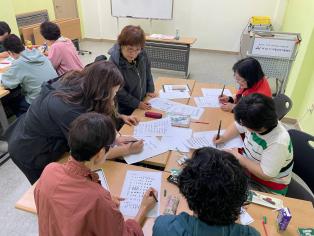 - 24일 아산시 요양보호사 동아리 두 번째 시간을 가졌습니다. 캘리그라피를 배우기 위해 퇴근 후 함께 자리해 주셔서 너무 감사했습니다. 붓펜을 잡은 다소 거친 손마디가 조심스럽게 한 글자 한 글자 써 내려가는 모습은 봄꽃 한 송이를 손에든 소녀 같았습니다. 차분해지고 맑아지는 기분을 느끼며 서로의 글자와 그림에 함박웃음을 지었습니다. 아이처럼 웃는 모습에 벌써 보람을 느낍니다. 다음 시간은 5월 8일 목요일 저녁 7시에 있습니다.