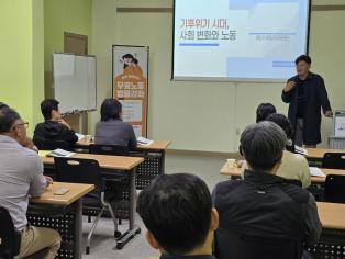 - 4월 29일 화요일 19시~21시까지 무료노동법률강좌 4강을 진행하였습니다. 이번 강좌는 원주지속가능발전협의회 제현수 사무국장님께서 함께 해주셨습니다. 4강은 ‘기후위기와 노동’을 주제로 기후의 변화로 인해 미래에 노동이 어떤 모습으로 변화될지에 대해 알아보았습니다. 문제가 되고 있는 탄소배출과 30년후의 모습을 생각해보았을 때 우리가 현재 어떤 변화를 일으켜야 지금보다 나아진 환경에서 살 수 있을까 고민하는 시간도 가지며, 지금의 변화들로 인해 노동의 환경에서 바뀔 직업들 사라지게 될 직업 또는 각광 받게 될 직업에 대해 알아보았습니다. 짧은 두 시간 안에 기후의 위기와 노동을 다 알아보기에는 모자랐지만, 새롭게 알게되는 내용들과 궁금한 부분에 대한 질의응답 시간으로 너무 재밌고 흥미로운 시간이였습니다. 4월 29일을 마지막으로 올해의 법률강좌는 종료되었습니다. 내년 법률강좌에도 노동자와 아산시민 여러분들의 흥미를 끌 수 있는 재밌고 다양한 주제로 찾아뵙겠습니다. 이번 강좌에 관심을 가지고 참석해주신 분들께 감사드립니다.