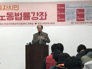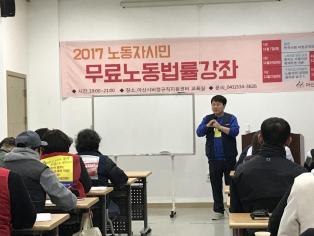 - 2017 하반기 노동자시민 무료노동법률강좌 를 많은 분들의 참여하신 가운데 진행했습니다. 1강을 강의해 주신 단병호 대표(현_평등사회노동교육원, 전_민주노총 위원장, 전_국회의원)는 한국사회 비정규직 문제의 역사적 과정, 현재 비정규직노동자들의 상황과 처지, 앞으로 노동과 관련 된 정책에 예상되는 방향등 다양한 시각에서 노동조합이 해야 할 역할과 바라는 점에 대해 소중한 강연을 해주셨습니다. 2강(11/14 화요일 19:00)에는 이서용진 노무사님을 모시고, 노동조합의 설립과 운영에 대한 모든 것을 사례를 포함하여 상세히 알아보는 시간을 갖습니다. 참여를 원하시면 041-534-3626으로 신청해주시기 바랍니다.