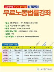 - 2017년 노동자시민 무료법률강좌2 노동조합에 대한 궁금증, 집단적 노사관계(노사협의, 노동조합)에 대해 궁금증 속 시원한 해법을 찾아보세요! 누구나 신청하실 수 있습니다. 필요한 강의만 별도로 신청도 가능하며, 1강 인문학 강좌는 신청하시지 않으신 분도 당일 참여 가능합니다. ◦ 일시 : 11월 7일부터 매주 화요일(저녁 7시00분~21시 00분) ◦ 장소 : 아산시비정규직지원센터 교육실 ◦ 참가대상 : 아산 시민, 노동자, 직장인, 취업준비생, 학생 등 누구나 ◦ 접수 및 문의 : kctucnas@hanmail.net / 041)534-3626 ◦ 접수기간 : 3월 20일~3월 31일 ◦ 모집인원 : 선착순 30명 ◦ 참가비 : 무료